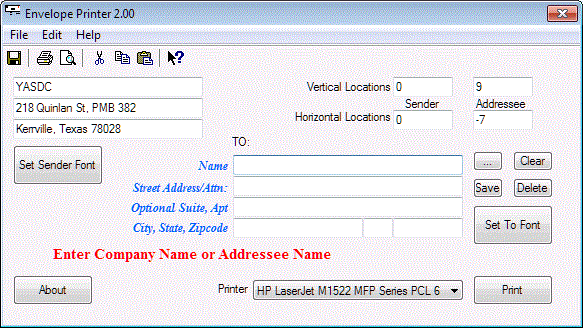 Quick and simple #10 Envelope Printing software with built-in address book. Automatically print and save with one click or you can save multiple addresses without printing. Address book remains sorted at all times. Simple text file stores all data for easy import of large address databases. Automatic zipcode lookup of most cities and states